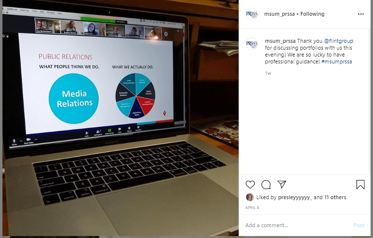 PRSSA Meetings: I assisted in planning weekly meetings with the PRSSA executive board. My role was to email our speakers and communicate with them the plan for the meeting. With COVID-19, this role became more important as I had to communicate the change to meetings over Zoom with our speakers.
